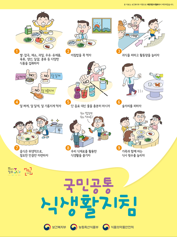 올해 4월 보건복지부에서 농림축산식품부, 식품의약품안전처와 공동으로 국민의 건강하고 균형잡힌 식생활 가이드라인을 제시하는 「국민 공통 식생활 지침」이 제정·발표되었습니다.
