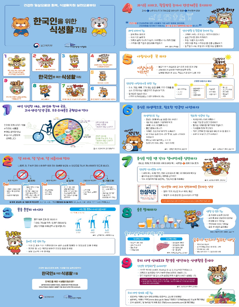 보건복지부에서는 농림축산식품부, 식품의약품안전처와 공동으로 「한국인을 위한 식생활지침」 9가지 수칙을 발표했습니다. 식생활지침은 건강한 식생활을 위해 일반 대중이 쉽게 이해할 수 있고 일상생활에서 실천할 수 있도록 제시하는 권장 수칙으로 식품 및 영양섭취, 식생활 습관, 식생활 문화의 내용으로 구성되었습니다.
