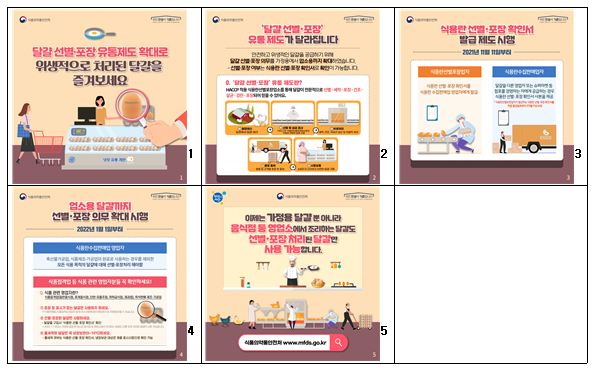식품의약품안전처에서는 '달걀 선별 포장 유통제도' 확대 시행과 관련하여 카드뉴스를 제작 및 배포하였습니다. 업무 시 참고바랍니다.