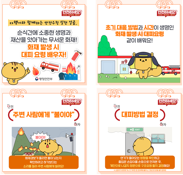 이에 행정안전부에서 제작한 "화재 대피요령" 내용이 담긴 "안전수칙 카드뉴스"와 "안전동화(성냥팔이 소녀)"를 공유드리오니, 회원 여러분께서는 적극 활용하여 확산해주시기 바랍니다.