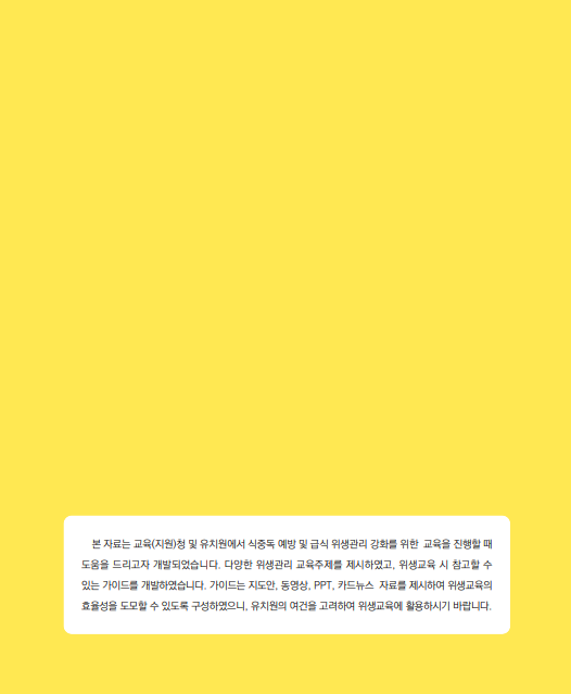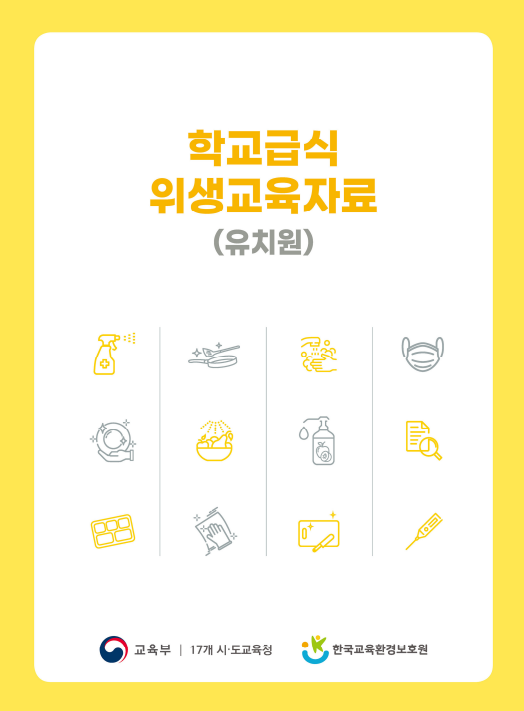 교육부와 한국교육환경보호원은 교육(지원)청 및 학교에서 식중독 예방 및 급식 위생관리 강화를 위한 교육을 진행할 때 도움을 드리고자 '학교급식 위생교육자료'를 개발하였습니다.