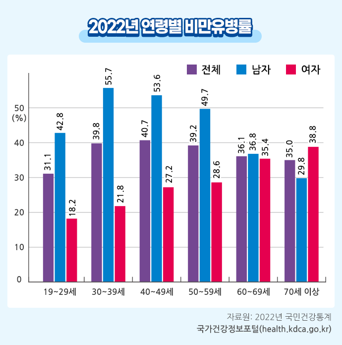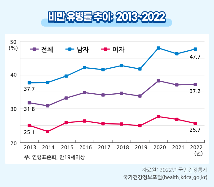 최근 10년간 비만 유병률은 증가하는 추세로, 2022년 기준 성인의 비만 유병률은 37.2%, 60대에서 36.1%, 70세 이상에서 35.0%를 보이고 있습니다.