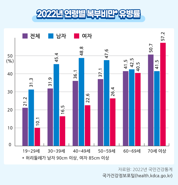 연령대가 높아지면서 복부비만 유병률 또한 높아지는 추세로, 남자는 40대에서 48.8%로 복부비만 유병률이 가장 높았고, 여자는 70세 이상에서 57.2%로 가장 높은 복부비만 유병률을 보였습니다.