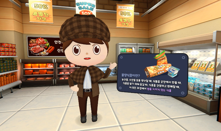 식품의약품안전처는 VR 기술(시선기반의 상호작용 방식사용)을 활용하여 어린이들이 불량식품에 대한 올바른 지식을 쉽고 재미있게 습득할 수 있도록 「불량식품 탐정」 가상현실(VR: Virtual Reality) 학습형 앱(App)을 개발하였습니다.