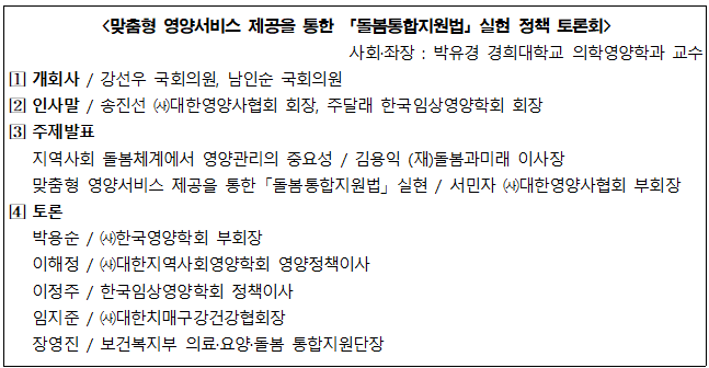 이어 남인순 의원은 “새로운 돌봄체계에 맞춰 노인과 장애인 대상 돌봄의 전면 재조정이 필요한 현 시점에서 식생활 및 영양상태가 열악한 거동 불편 노인과 장애인에게 맞춤형 영양서비스 제공은 매우 중요하다.”라고 강조하며, “이번 토론회가 다양한 각계 전문가가 모인 자리인 만큼 깊이 있는 토론으로 맞춤형 영양서비스 제공을 통한 바람직한 실현 방안을 모색하는 소중한 자리가 되길 바란다.”라고 전했다.