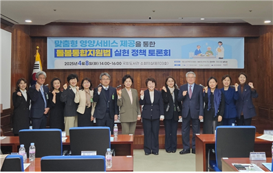 우리 협회에서는 4월 8일(화) 국회 보건복지위원회 더불어민주당 간사 강선우 국회의원·남인순 국회의원 주최로, ㈔대한영양사협회, ㈔한국영양학회, ㈔대한지역사회영양학회, 한국임상영양학회가 공동주관하여 맞춤형 영양서비스 제공을 통한 「돌봄통합지원법」 실현 정책 토론회를 개최하였다. 본 정책 토론회에서는 「의료·요양 등 지역 돌봄의 통합지원에 관한 법률(2024.3.26. 약칭: 돌봄통합지원법)」이 제정되어 2026년 시행을 앞두고, 지역사회 돌봄에서의 맞춤형 영양서비스의 중요성을 인식하고 지역 의료·요양·돌봄체계에서 영양정책의 추진방향을 제안하고자 개최하였다.