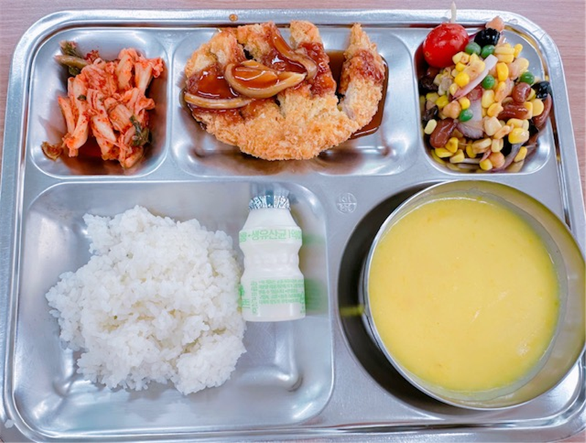찹쌀밥, 단호박스프, 등심돈가스, 지중해식옥수수콩샐러드, 포기김치, 저당요구르트