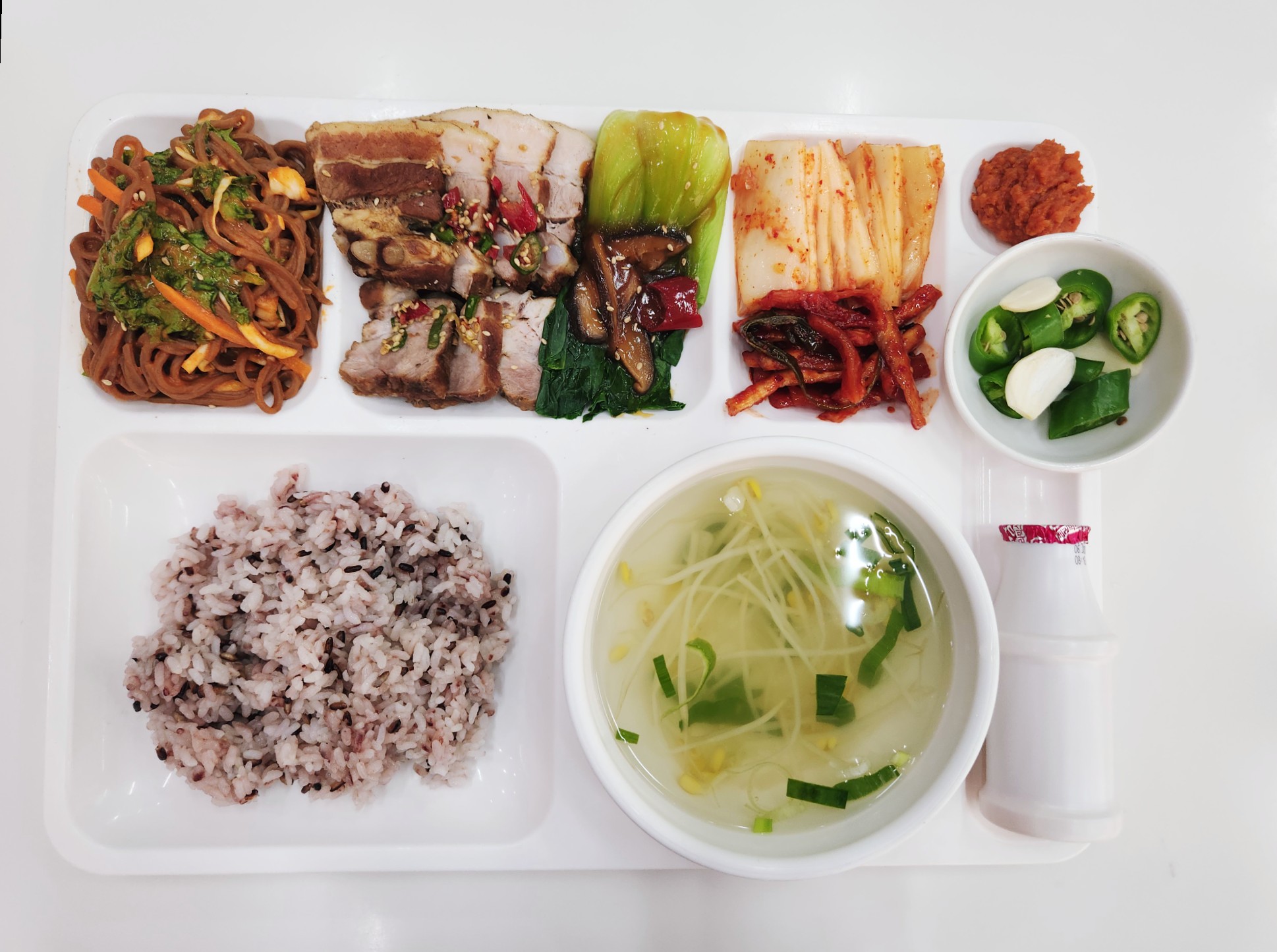 잡곡밥, 오향장육, 표고버섯굴소스청경채통찜, 비빔막국수무침, 양념무말랭이지, 고추마늘슬라이스/쌈장, 대파콩나물국, 포기김치, 요구르트