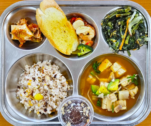 단호박보양찰밥, 동태찌개, 감바스, 수제섬초꼬막전, 배추김치, 흑백밤티라미수