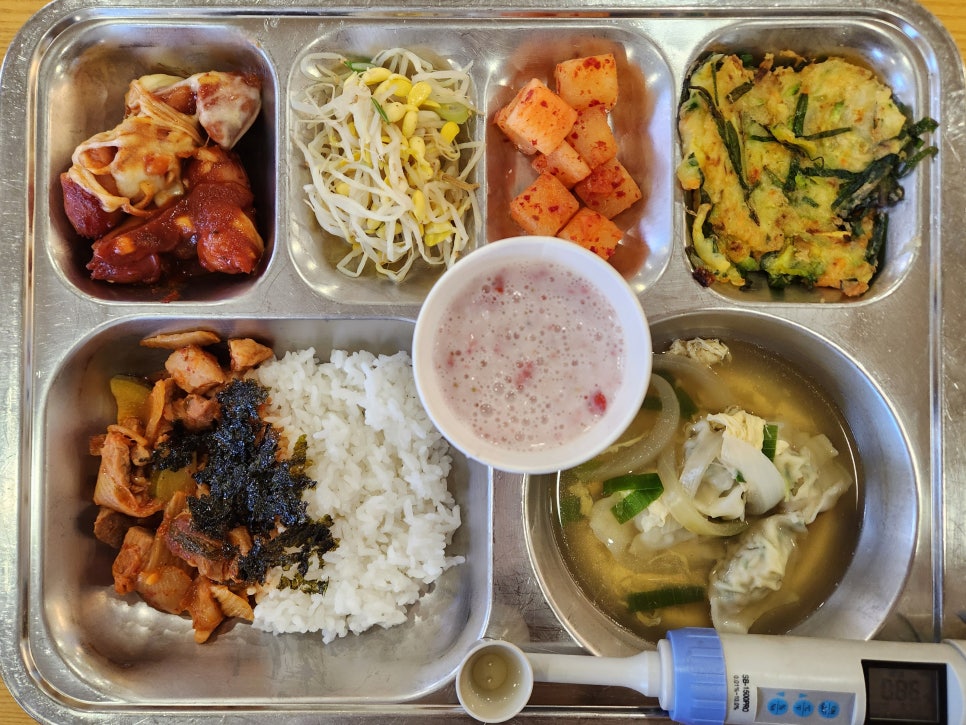 돈육짜글이덮밥, 물만둣국, 비엔나그라탕, 애호박부추전, 콩나물무침, 깍두기, 수제딸기라떼