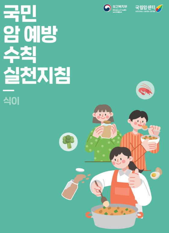 국립암센터에서 '국민 암 예방 수칙' 중 '채소와 과일을 충분하게 먹고 다채로운 식단으로 균형 잡힌 식사하기'와 '음식을 짜지 않게 먹고, 탄 음식을 먹지 않기' 실천을 통해 암을 효과적으로 예방하는 데 도움을 주고자 「국립 암 예방수칙 실천지침(식이)」를 발간하였습니다.
