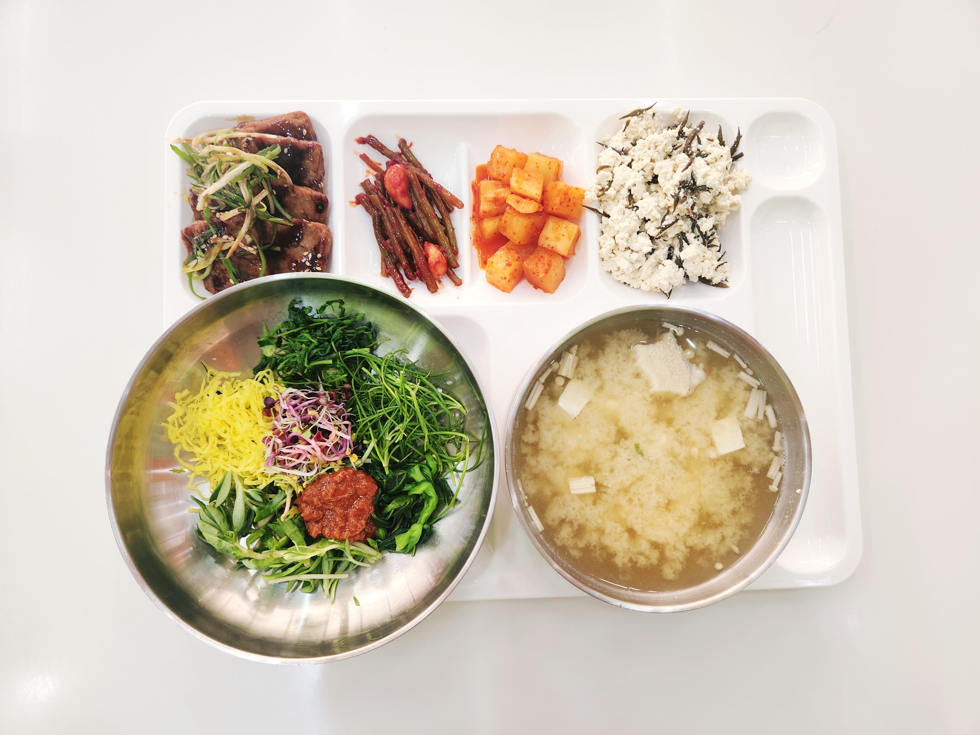 냉이봄나물비빔밥&수제고기약고추장, 일식미소장국,파채고기산적찜, 톳나물두부무침, 양념마늘쫑무침, 깍두기