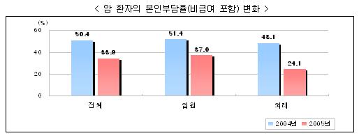 암환자 2004년 본인부담 50.4%에서 2005년 33.9%로 줄어암환자는 2004년도에 전체 진료비의 50.4%를 본인이 부담하였으나, 2005년에는 전체 진료비의 33.9%만 부담한 것으로 나타났습니다. 2006년 6월 이후 식대가 건강보험이 적용되기 때문에 본인부담은 더욱 낮아졌을 것으로 예상되며 현재 조사 중에 있습니다.