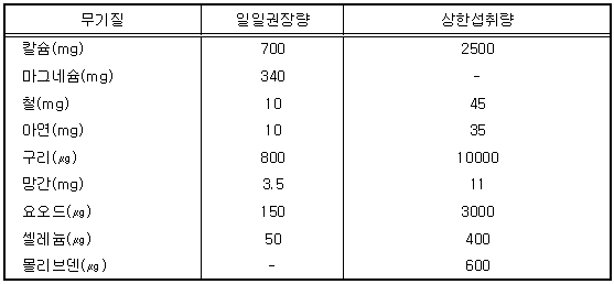 식약청은 일상식품이나 강화식품, 건강기능식품을 통한 비타민.무기질 과잉섭취를 막기 위한 조치로 한국영양학회와 공동으로 2년간에 걸쳐 위해평가를 실시, 비타민 8종과 무기질 9종 등 총 17종의 영양소에 대한 일일권장량과 상한섭취량 등 소비자를 위한 가이드라인을 제시했다.